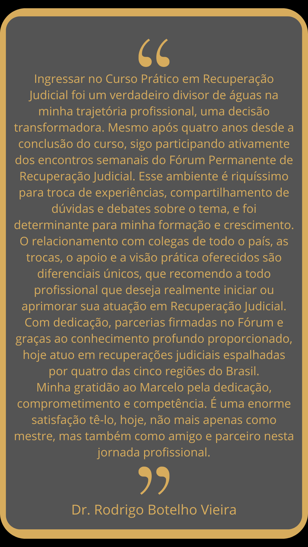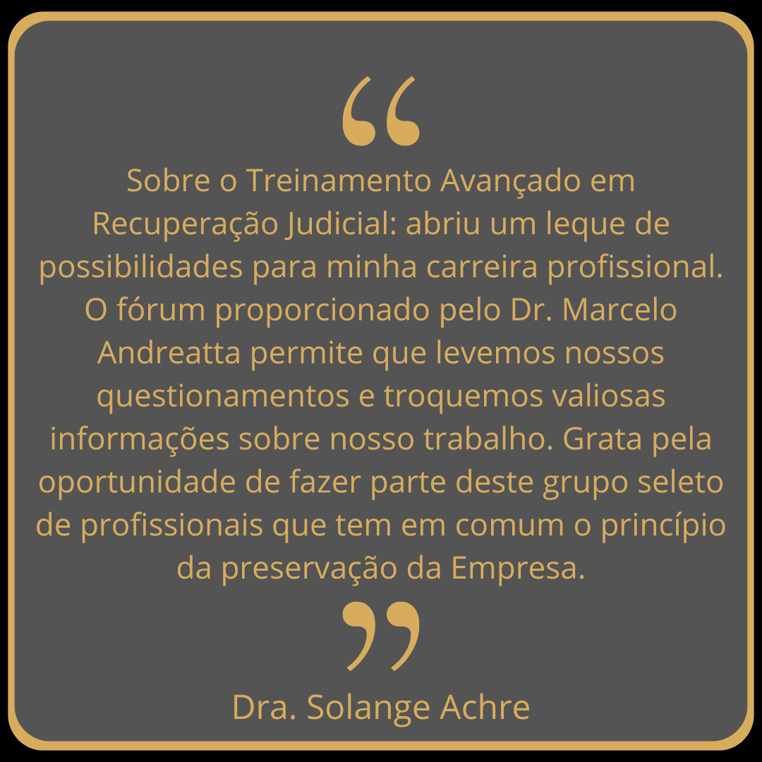 Não é razoável que apenas grandes companhias se beneficiem do instituto enquanto empresas com dívidas de um ou cinco milhões não usufruam dos benefícios da Lei de Recuperação de Empresas. Para esta revolução eu conto com colegas que tenham disposição de construir um posicionamento estratégico visando o trabalho com o instituto.